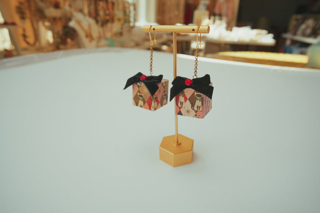 These large, 3-inch drop earrings are designed to look like charming little Christmas gifts. They are crafted from wooden beads wrapped in festive paper featuring a fun cat print.